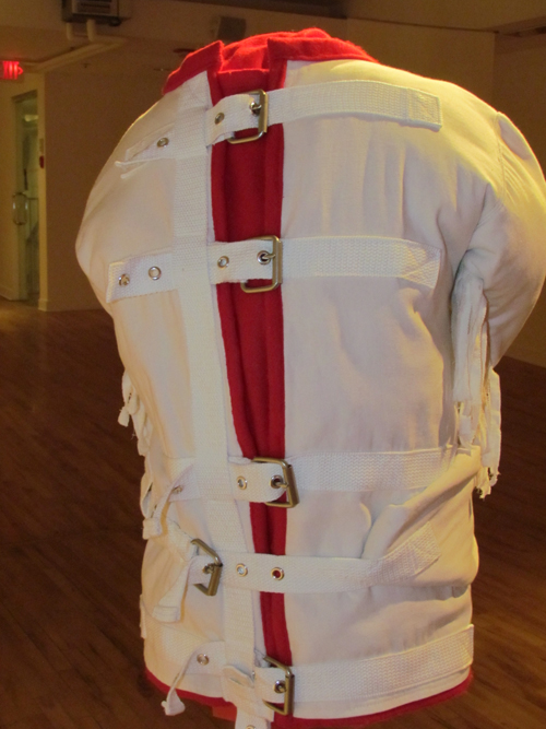 Malbeuf’s installation of animal pelts strung up was originally presented in a park in Edmonton. The piece is tactile, drawing the viewer in until the backside is viewed; each pelt has a safety vest on the reverse. The relationship between the two sides forms a point of intellectual inquiry.