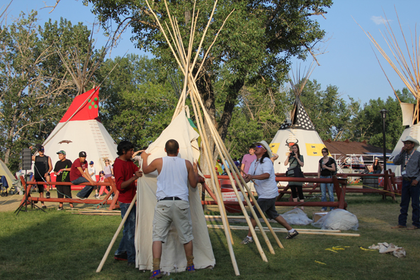 Tipi-raising racers pull canvas around poles as a demonstration at Indian Village at the Calgary Stampede. The Stampede celebrated 100 years this past July.