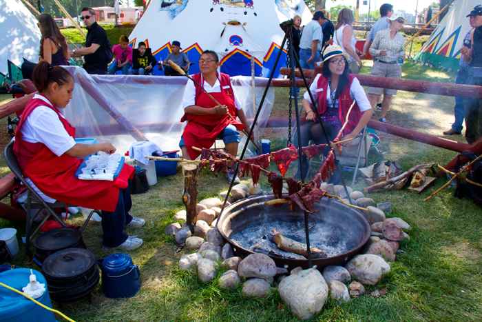 Adrian Wolfleg, interpretative program director, and his interpreters in bright-red jackets were available to educate visitors on the way Natives lived in Canada in the past. Cooking demonstrations showed how bannock is made, meat smoked over smoldering coals and refreshing juice made from freshly squeezed berries. Visitors could also take a peek inside one of the 27 tipis, or browse the authentic jewelry on sale.