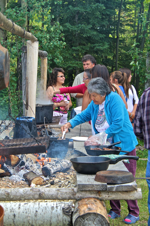 Nora Yellowknee prepares food at the traditional camp fires as August Yellowknee and family look on and visit. It was all part of Bigstone Cree Day celebrations in July in Wabasca.