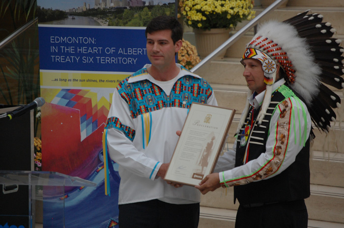 Edmonton Mayor Don Iveson and Alexis Nakota Sioux Nation Chief Tony Alexis, standing in for the Grand Chief, proclaimed Sept. 25 as Treaty 6 Recognition Day. The two were joined by other Treaty 6 Chiefs in a special ceremony held at City Hall. “Edmonton values are treaty values,” said Iveson, “and all people are welcome here.” The event allows the city to further strengthen Edmonton’s renewed relationship with the Confederacy of Treaty 6 First Nations.