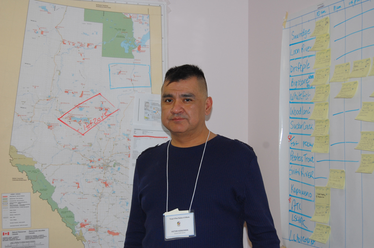 Photo Caption: Victor Horseman in the situation room at the Treaty 8 sub-office: a map marks the status of the fires and the whiteboard keeps track of damage and evacuation notices.