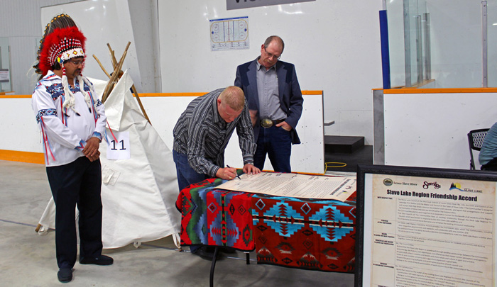 Photo caption: Sawridge Chief Roland Twinn and MD of Slave River Reeve Murray Kerik watch as Slave Lake Mayor Tyler Warman signs the friendship accord.