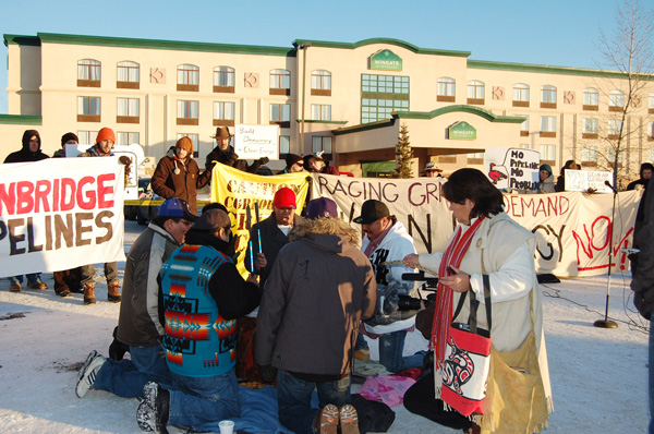 Photo caption: Enoch First Nation drumming group and protestors demonstrated outside the Wingate Inn in Edmonton’s west end where community hearings took place for the Northern Gateway project.