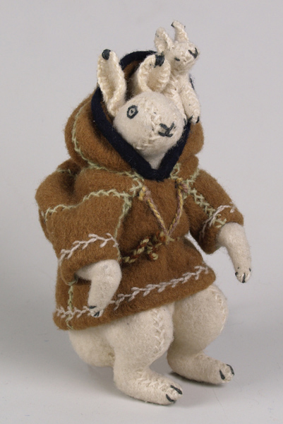 Inuit girls begin sewing at 10 years of age, making dolls and removable clothes. They also learn other necessary skills such as skinning of animals. The name packing dolls refers to the parka devised with a baby pouch that is tailored as part of the mother’s clothing but is hidden under a large hood. The pouch is large enough to allow the baby to be moved into position to nurse and moss is placed in the bottom to take the place of a diaper. The parka ensures the strong physical and emotional link between mother and child.