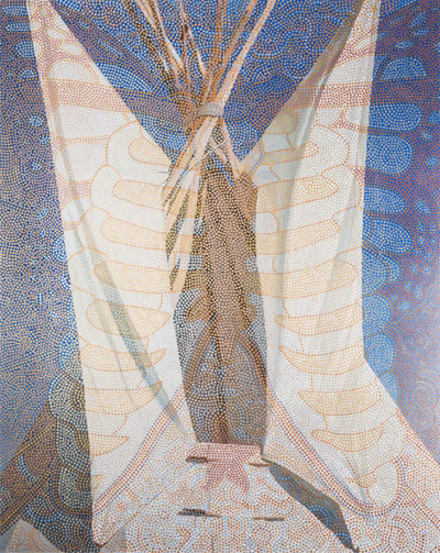 A focus of the painting is the top part of the tipi where the poles are. It opens up skyward.
