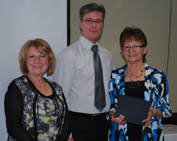 Aline Auger (right), teacher assistant at Mistassiniy School in Wabasca-Desmarais, was recognized for 35 years of service by principal Dafydd Thomas and Northland School Division Superintendent Donna Barrett. The school board recently gave out special achievement awards and long service awards to a wide range of employees, including bus drivers, teachers, administration and support staff.