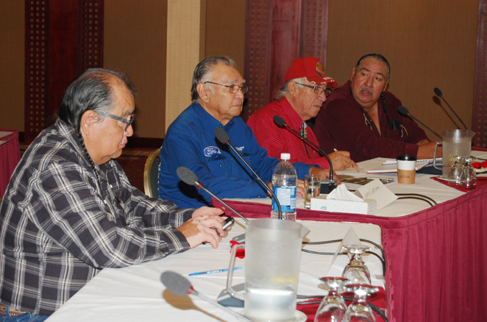 Samson Cree Nation delegation (from left) Councillor Pat Buffalo, Henry Lightning, Lawrence Saddleback, and Bison Dolphus Saddleback appeared before the National Energy Board to provide oral testimony in respect to Kinder Morgan’s proposed Trans Mountain pipeline expansion.