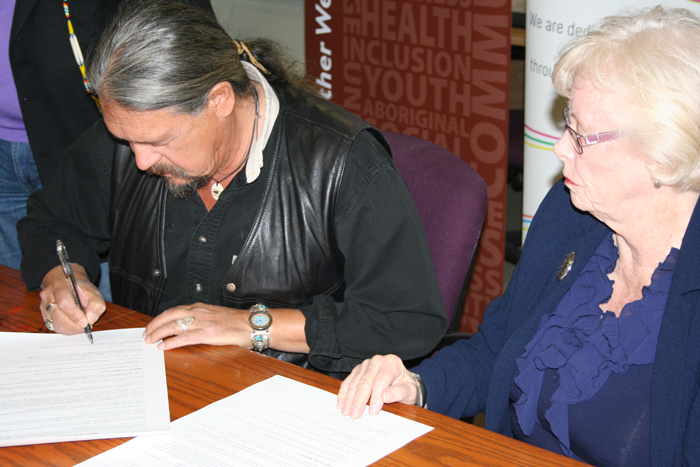 Photo caption: Both Merle White, executive director for the Canadian Native Friendship Centre, and Joan Cowling, president of the John Humphrey Centre, signed a Memorandum of Understanding, which marked the Truth and Reconciliation Commission’s visit to Edmonton earlier this year.