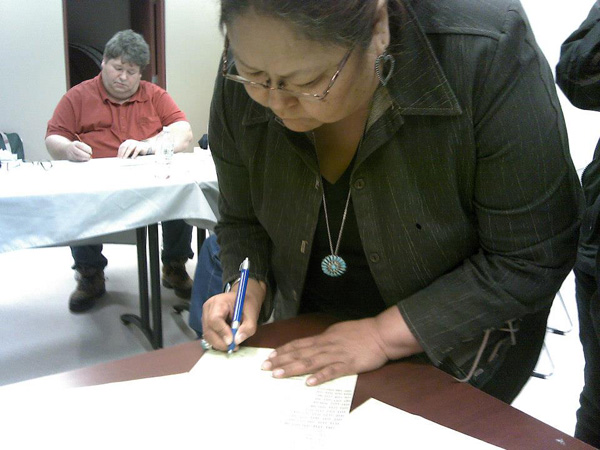 Photo caption: Following the December referendum, Siksika member Lilian Crow Chief, also concerned with the process, checked the totals with Aboriginal Affairs Canada Electoral Officer Daniel R. Silbernagel in the background.