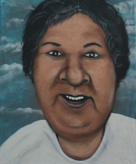 One of the difficulties with the murals, says Cook, is that some of the families don’t have control of a piece of property where the mural can be painted. Sandra Many Feathers suggested a solution to that. “What if you painted us a banner that we could bring to the vigils with us?” she said, and the idea took root.