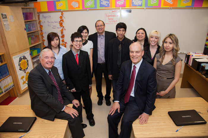 Photo caption: Students of the Aboriginal Youth Entrepreneurship Program at Kainai High School joined(front row)The Right Honourable Paul Martin (left) and Scotiabank President and CEO Brian Porter, (back row) with Blood Tribe Chief Charles Weasel Head (centre) AYEP teacher Darcie Thomas (second from right) and Kainai High School Principal Annette Bruised Head (third from right).