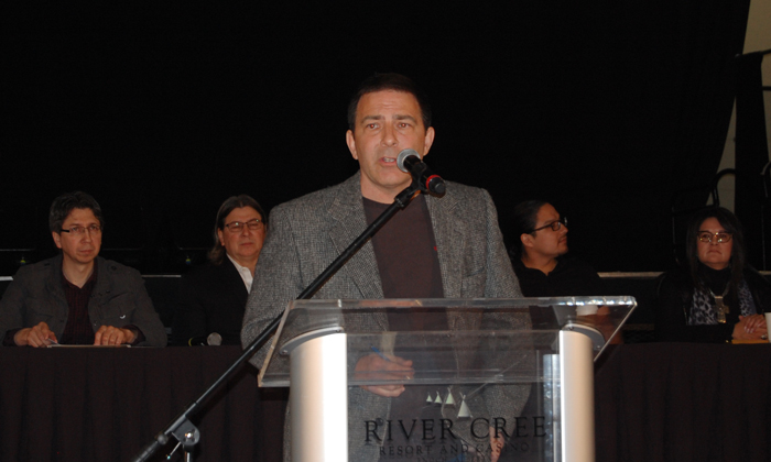 Photo caption: Enoch Cree Nation Chief Ron Morin (far left) looks on as Reg Letourneau talks about what his company turned up through accessing government information and doing its own probing.