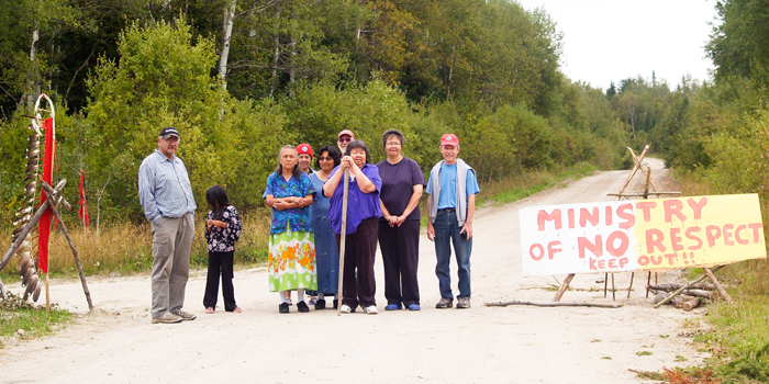 Members of Grassy Narrows have maintained a continuous blockade of the logging access road near their reserve since Dec. 2, 2002, when two members of the ad hoc Grassy Narrows Environmental Group stepped onto the gravel logging road by Slant Lake and raised their arms in front of a fully loaded truck of timber.