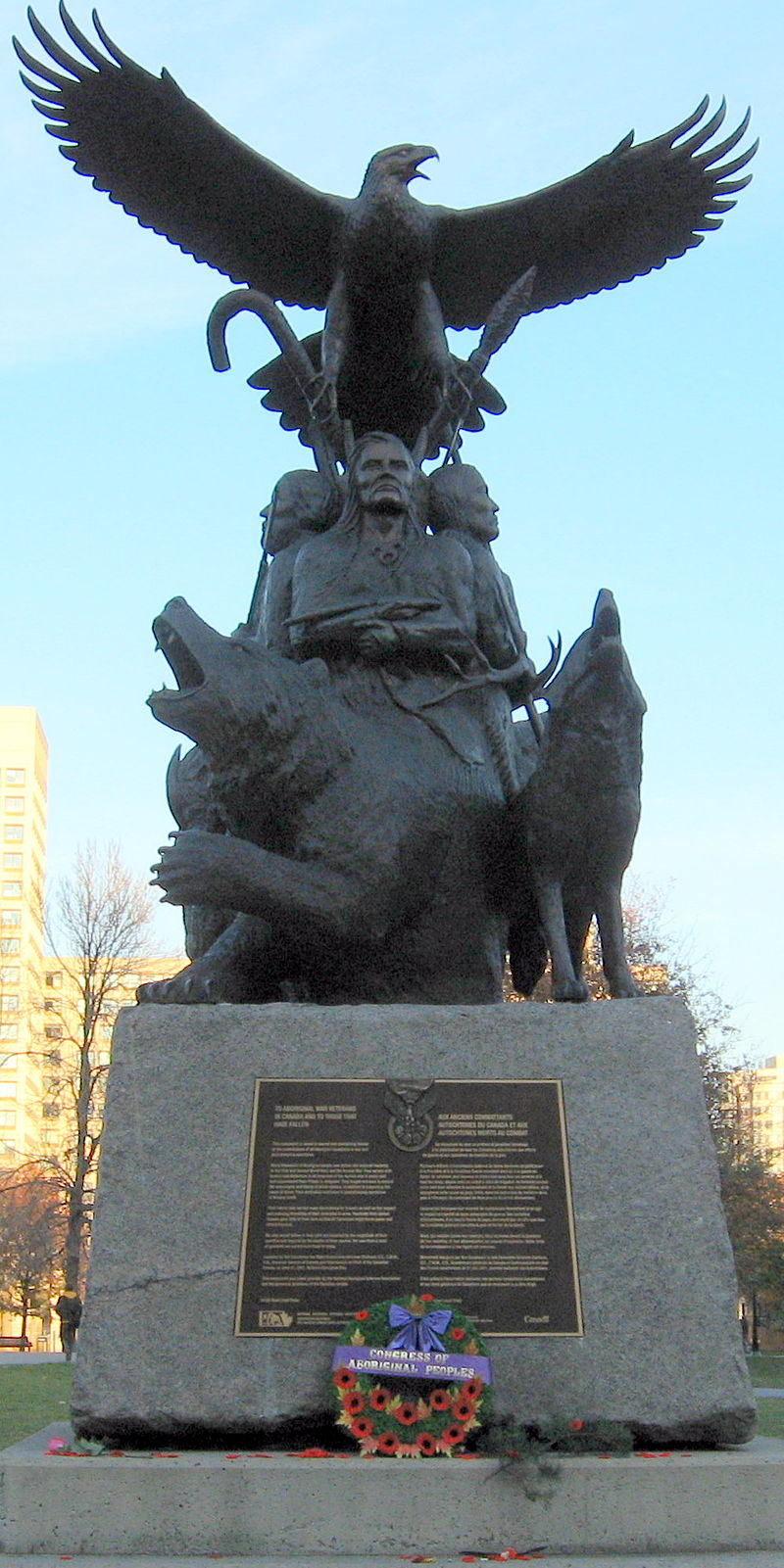 "This monument is raised in sacred and everlasting honour of the contributions of all Aboriginal Canadians in war and peacekeeping operations . . . They served with honour and distinction in all branches of the service from private to brigadier . . . Hundreds from across Canada gave ully of their lives so that all Canadians might know peace and inherit freedom."