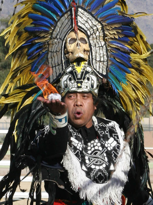 Photo Caption: Luis Salinas, from the Aztecs, performs in tribal dress.